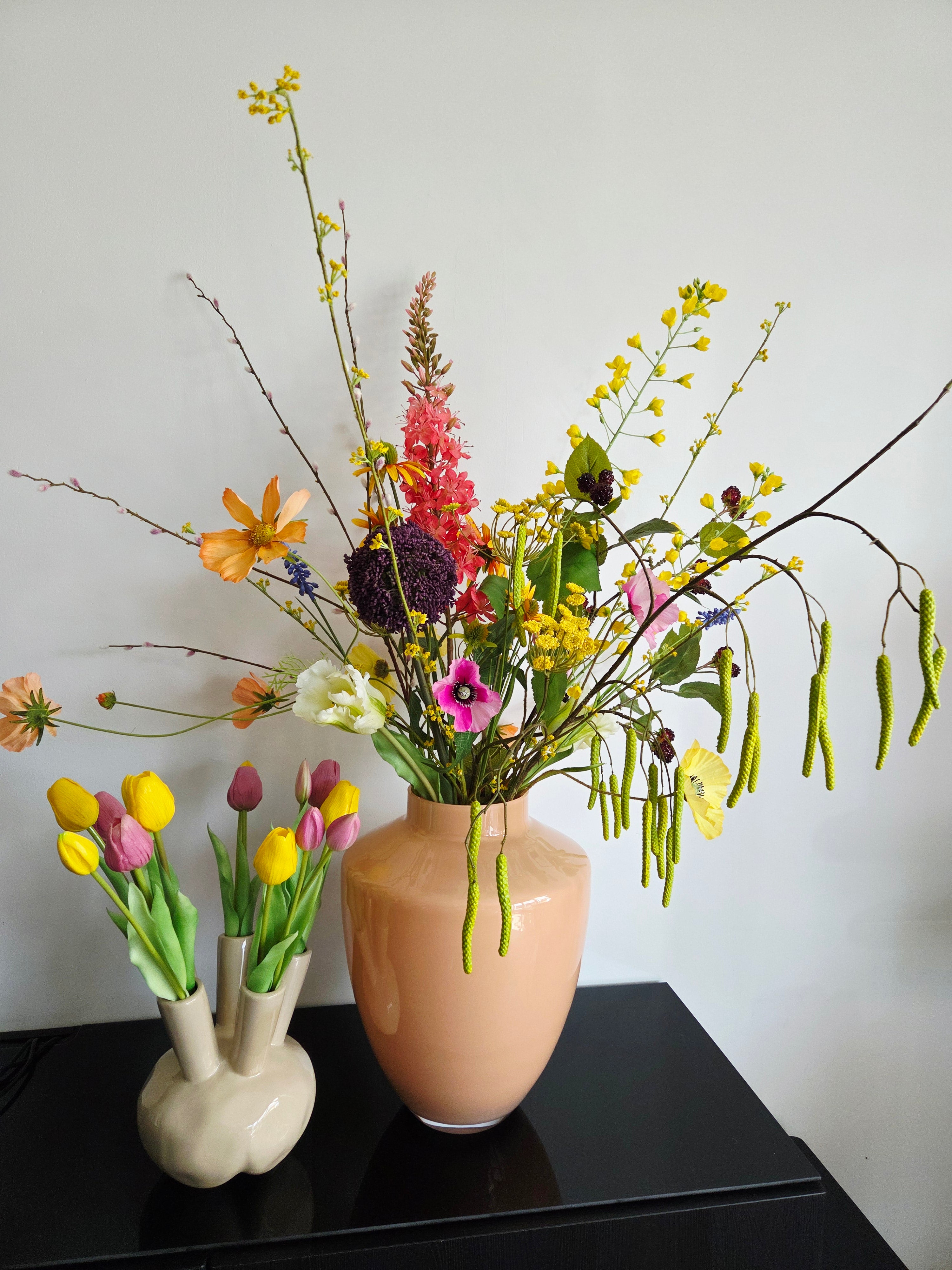 Geen paniek! Onze zijden bloemen zijn gemakkelijk op maat te knippen met een kniptang, let wel op dat de mogelijkheid tot retourneren vervalt wanneer er wijzigingen gedaan worden aan het boeket zoals knippen. Stijl het boeket naar wens en knip daarna de takken pas af om ervoor te zorgen dat de takken niet te kort worden. Zit er wat groen qua blad in de weg ter hoogte van de hals van de vaas? Deze kunnen gemakkelijk van de tak verwijderd worden. Omdat de kern van de bloemen voor een gedeelte bestaan uit o.a. ijzerdraad zijn de kleinere takjes gemakkelijk in elke gewenste richting te buigen. Maak er een mooi speels boeket van en buig de takjes door elkaar heen zodat er een mooie verdeling ontstaat!