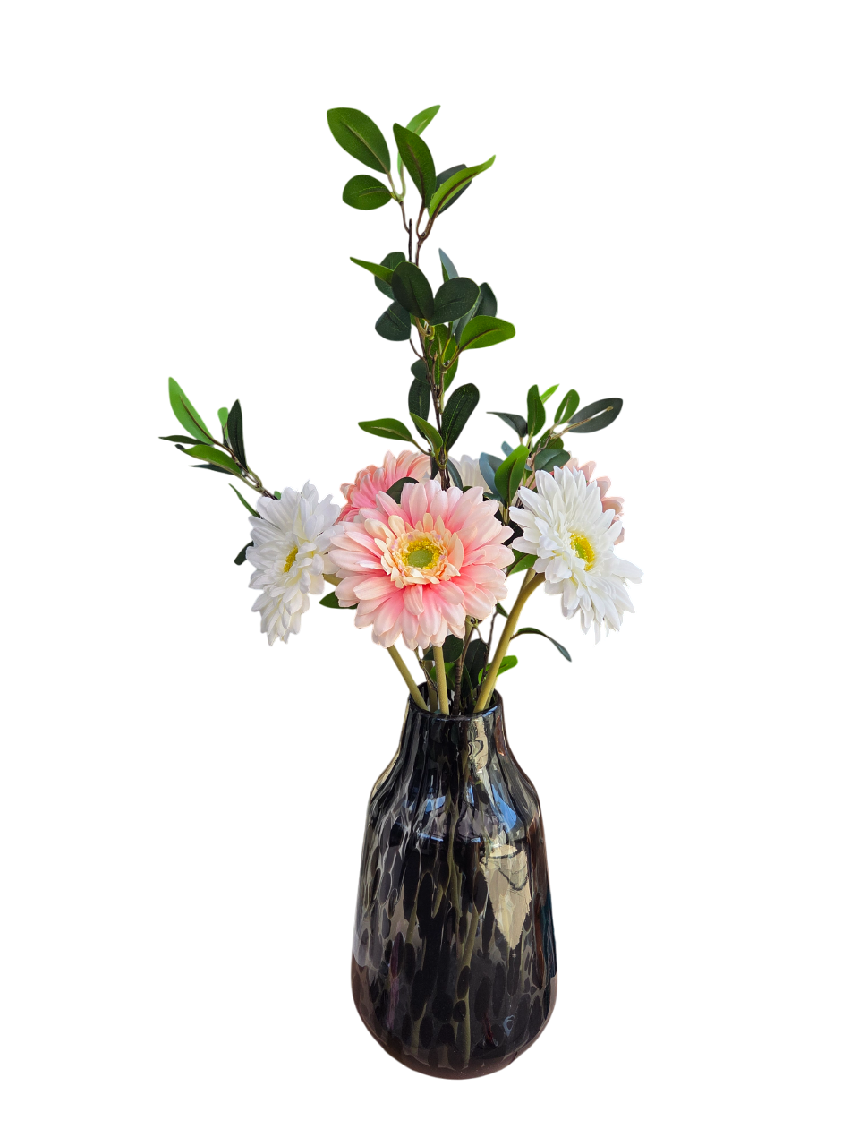 Hoe fantastisch is dit boeket met gerbera's! Het boeket komt zelfs met deze vaas van dik en stevig glas met donkergrijs cheetah print. Super chic en vooral handig te gebruiken met een ander kunst boeket!