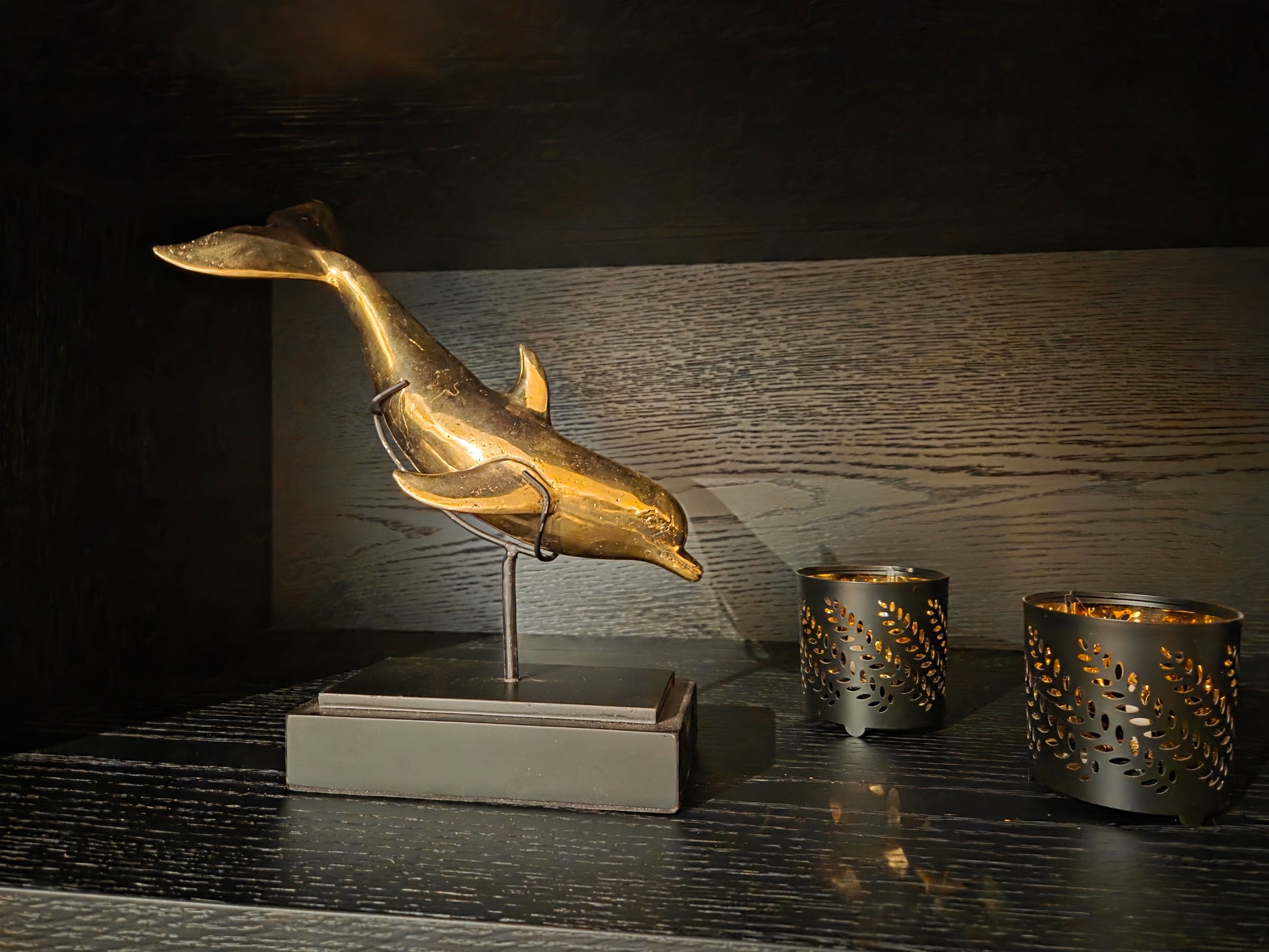 Deze elegante messing dolfijn op standaard, welke met zorg is vervaardigd door ambachtslieden in Indonesië, voegt een vleugje nautische charme en verfijning toe aan elke ruimte. De rijke gouden afwerking en fantastische details van de dolfijn, gecombineerd met zijn slanke standaard, maken het een opvallend statement voor thuis. Super chic ook! Beschikbaar in dolfijn en walvis.