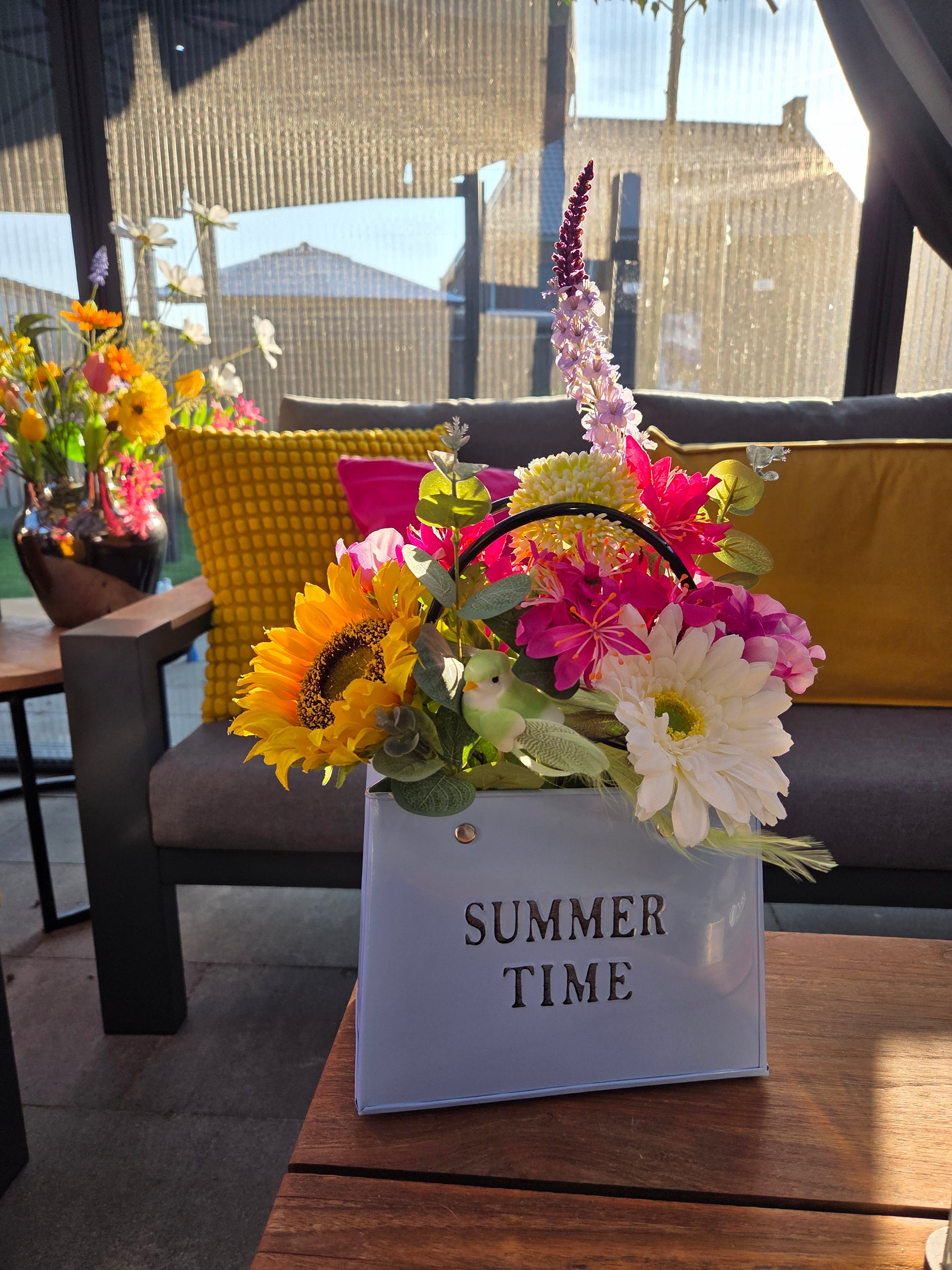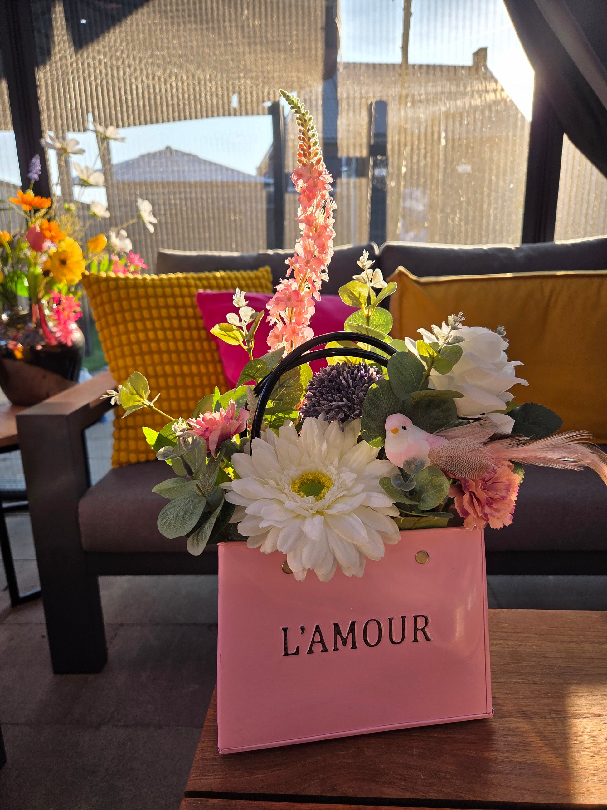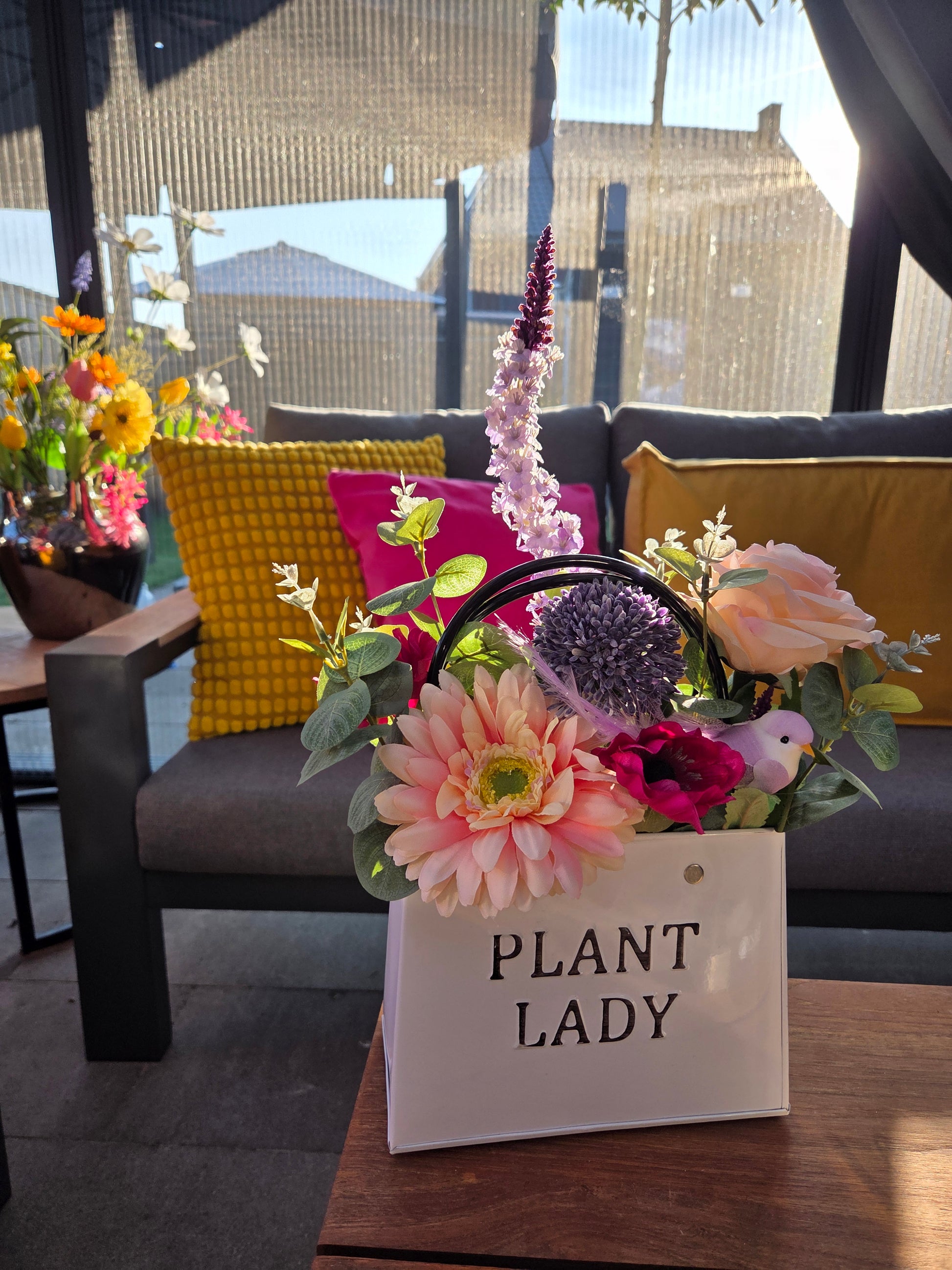 Volgende week een etentje bij vrienden, allergisch voor bepaalde bloemen, een bezoek aan schoonmoeders of gewoon geen zin in dorre bloemen en verdien jij zelf een cadeautje? Deze bloementasjes zijn daar perfect voor! De tasjes zijn herbruikbaar en van metaal. Ze zijn rijkelijk met de mooiste zijdenbloemen gevuld. Zo blijf jij niet met een metaal tasje zitten omdat de bloemen na 5 dagen zijn verwelkt..