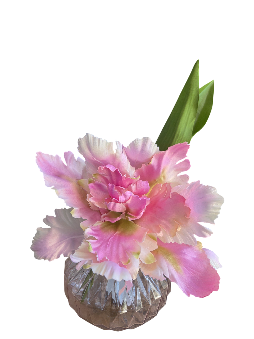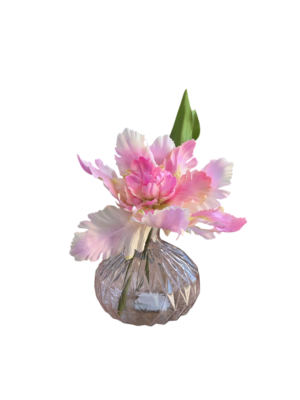 Dit kleine bloemstuk Tulip met roze vaas vindt altijd wel een plekje in het interieur! Eenvoudig, maar elegant.