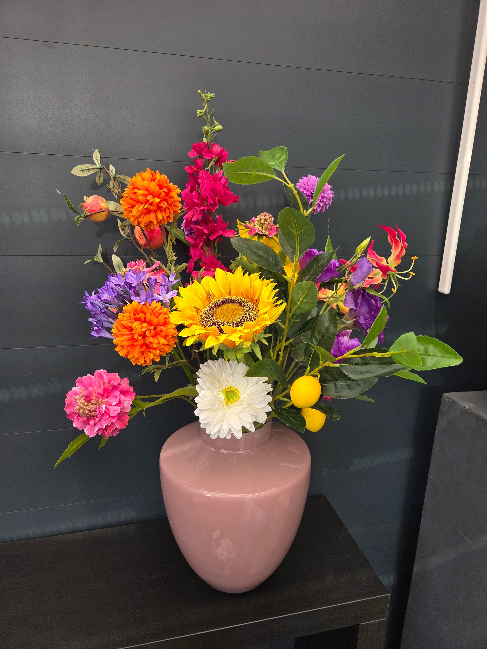 Boeket Zomers doet haar naam eer aan. Het boeket is opgebouwd uit verschillende kleurrijke bloemen en stukken fruit om zo een zomerse knaller in jouw interieur te zijn. Zomers, fruitig, vrolijk, maar ook chic te combineren met een mooie vaas uit onze collectie. Als dit geen eye-catcher is weten wij het ook niet meer!