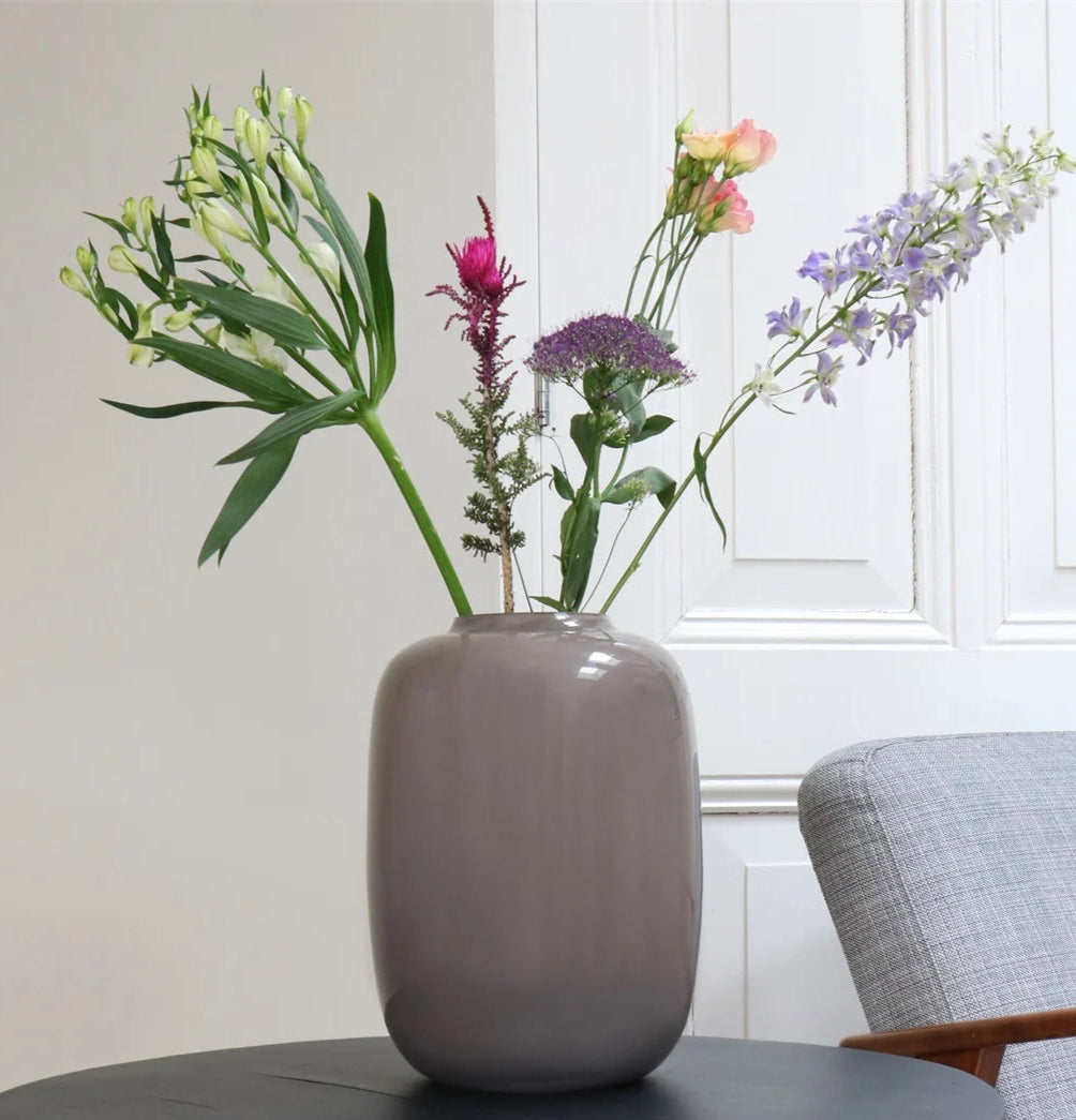 Hoe gaaf is deze aardkleurige vaas? Hij is prachtig te combineren met alle boeketten. Of het nu een kleurrijk boeket is of een rustiek boeket, een hele bos of juist een paar takken, alles past! Omdat deze vaas mondgeblazen is is letterlijk elke vaas uniek en geen 1 hetzelfde.