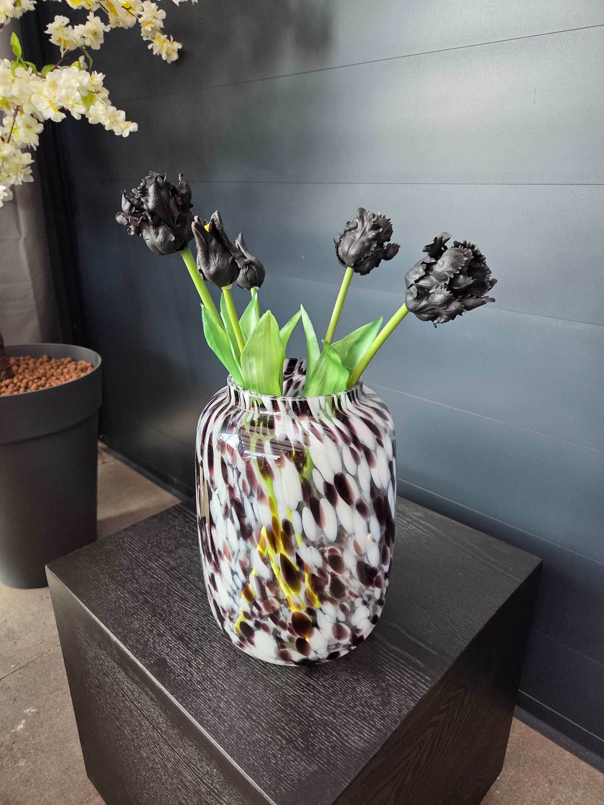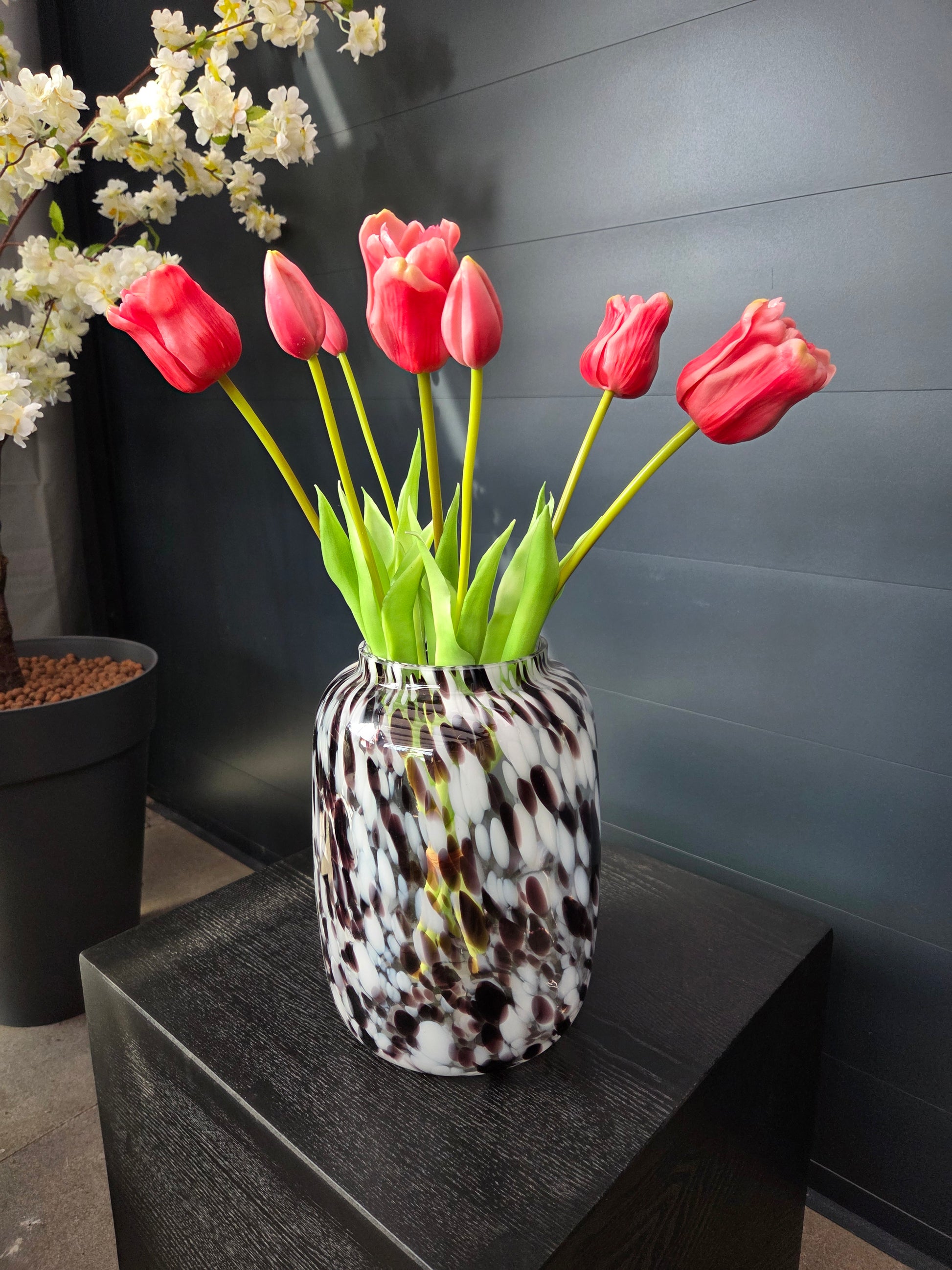 Hoe gaaf is deze gevlekte Housevitamin vaas? Hij is prachtig te combineren met boeketten of tulpen. Of het nu een kleurrijk boeket of een setje tulpen is, een hele bos of juist een paar takken, alles past!
