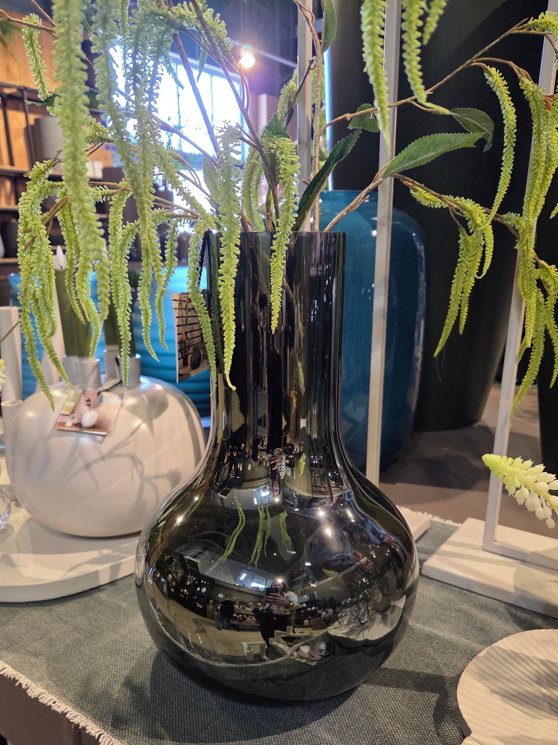 Hoe gaaf is deze spiegel koker vaas? Hij is prachtig te combineren met alle boeketten. Of het nu een kleurrijk boeket is of een rustiek boeket, een hele bos of juist een paar takken, alles past! Omdat deze vaas mondgeblazen is is letterlijk elke vaas uniek en geen 1 hetzelfde.