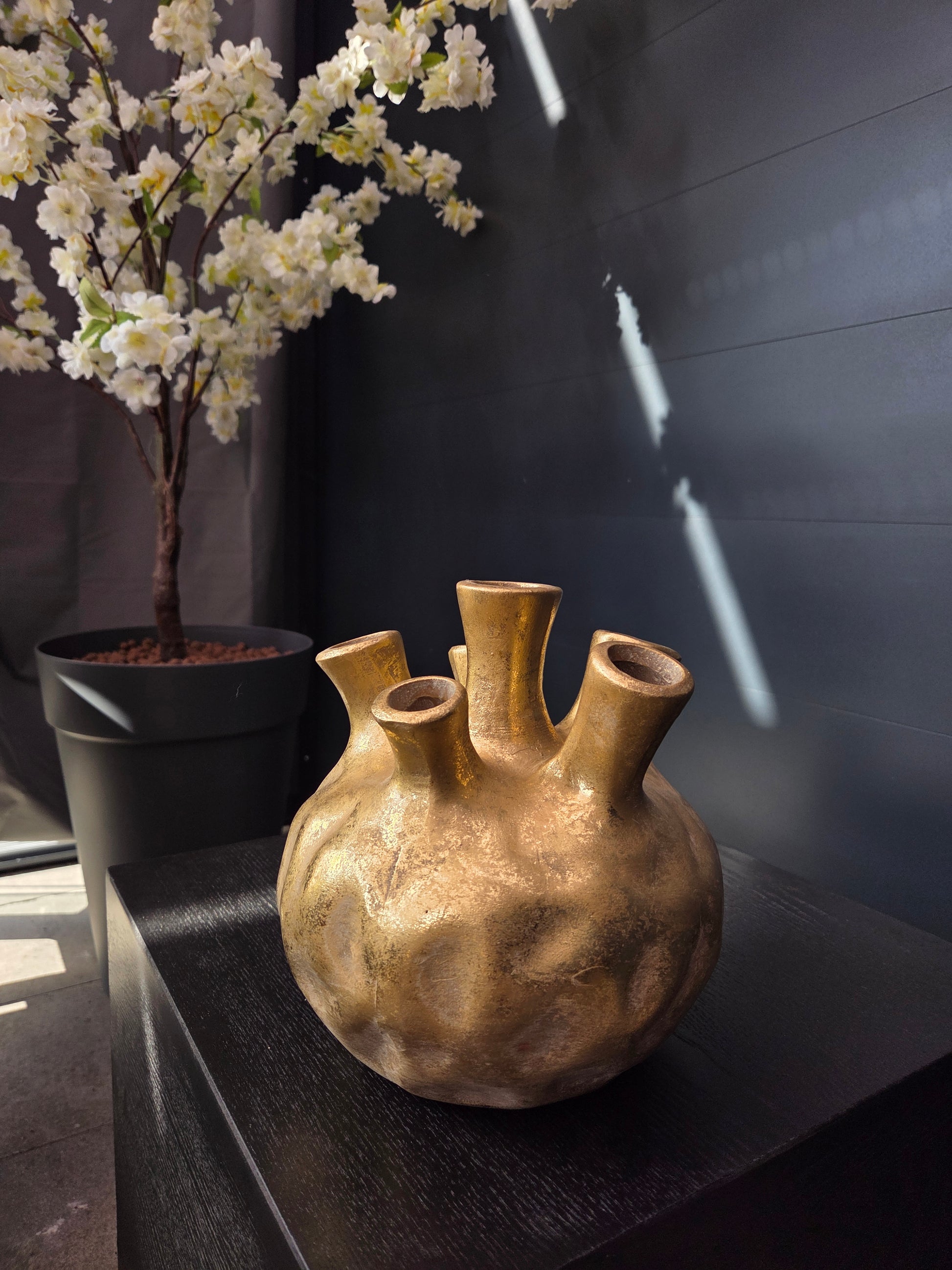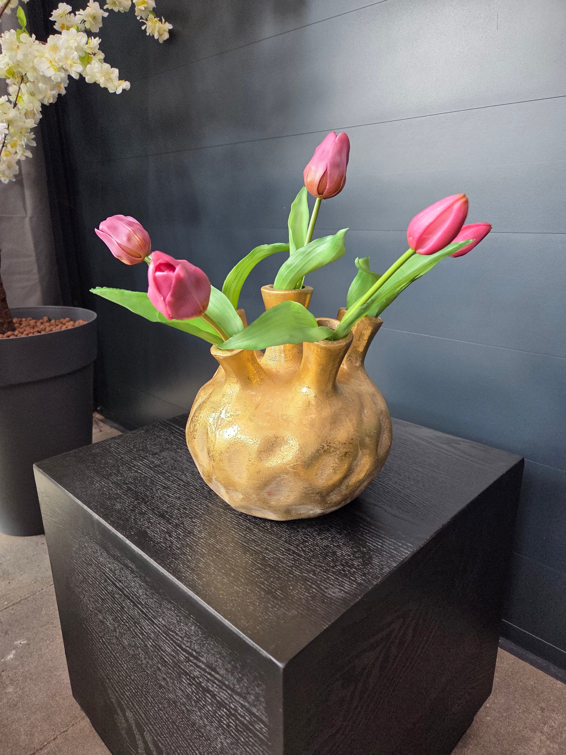 Deze stenen tulpenvaas is een stijlvolle en veelzijdige toevoeging aan jouw thuis. De zacht gouden of witte kleur en eenvoudige vormgeving stralen rust en elegantie uit, waardoor deze vaas perfect past in elk interieur. Verfraai hem met tulpen, een subtiel boeket of decoratieve takken, zo veelzijdig is deze vaas!