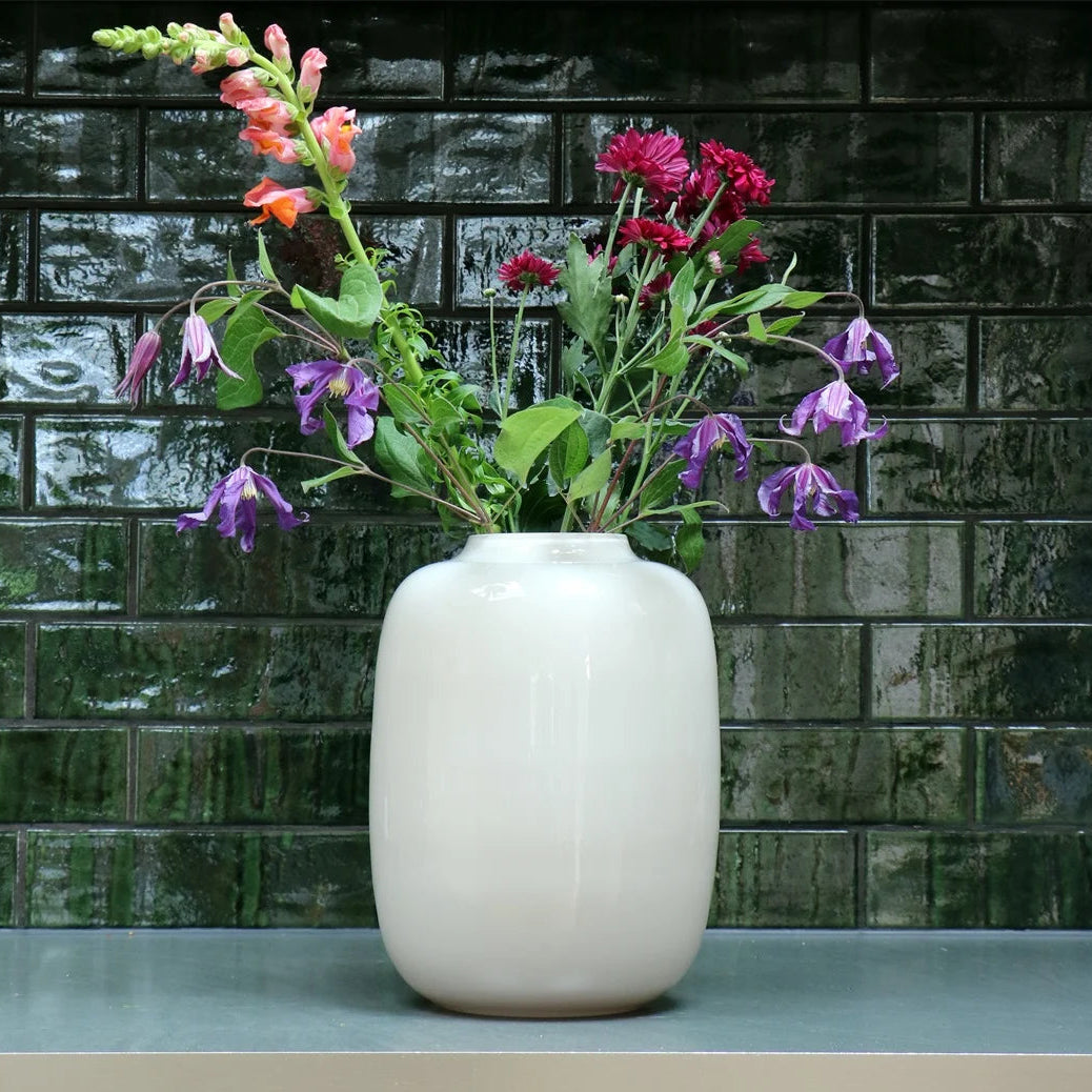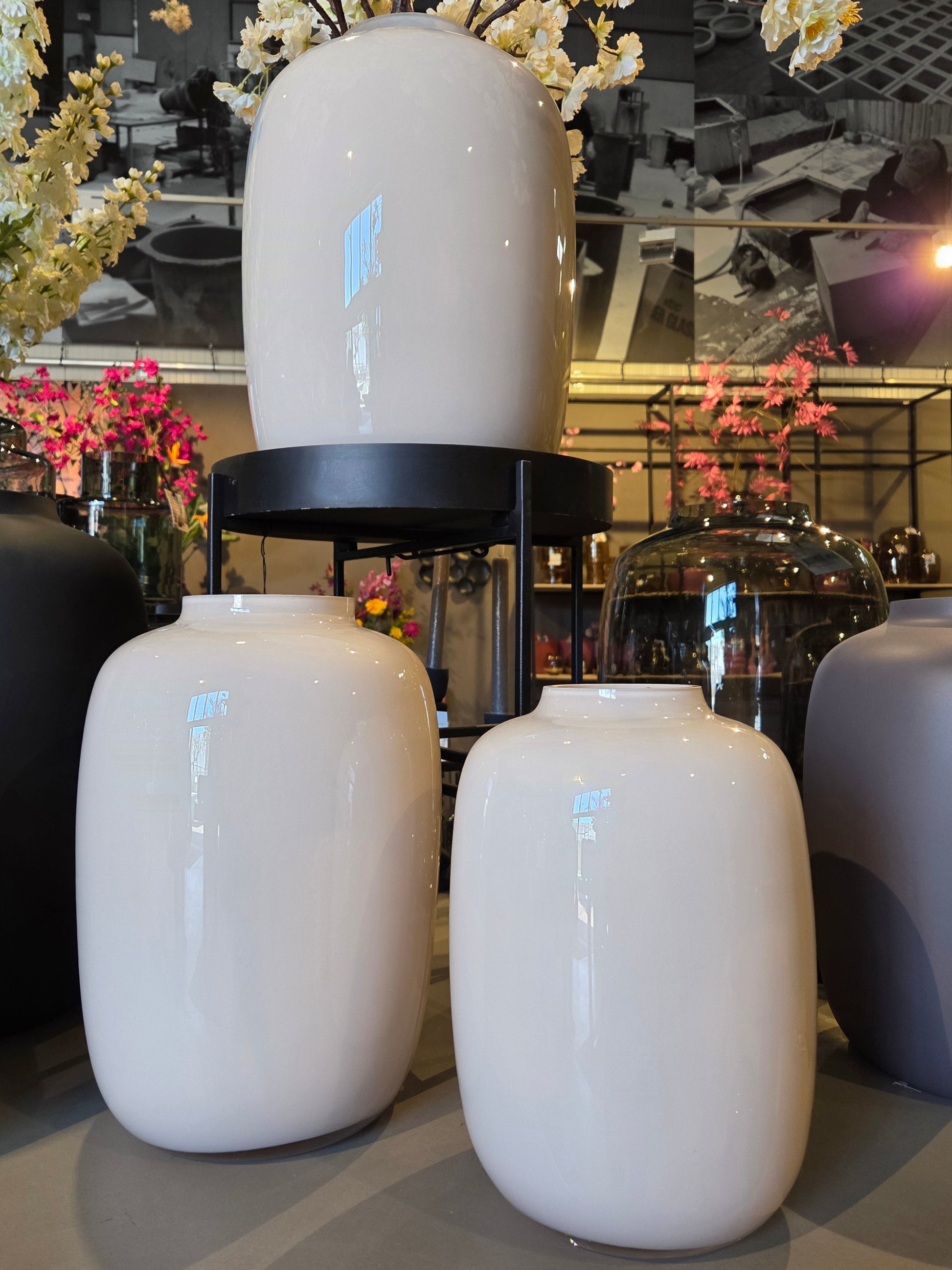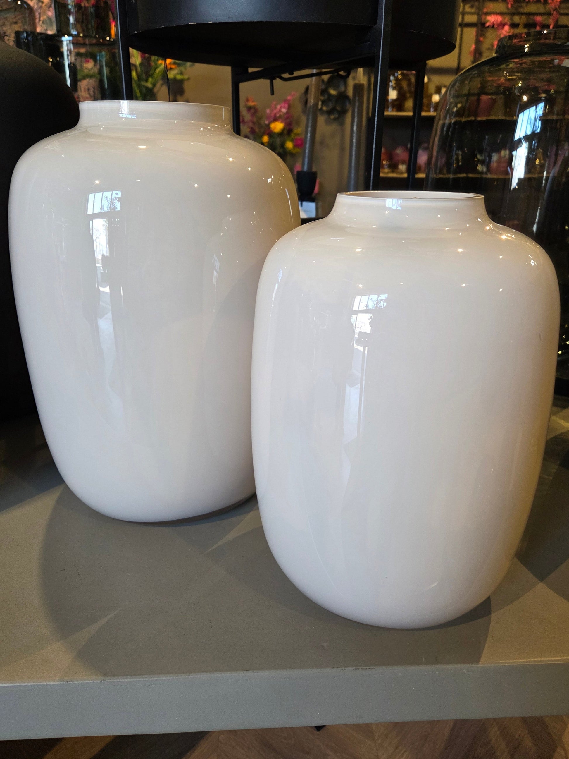 Hoe gaaf is deze ivoor kleurige vaas? Hij is prachtig te combineren met alle boeketten. Of het nu een kleurrijk boeket is of een rustiek boeket, een hele bos of juist een paar takken, alles past! Omdat deze vaas mondgeblazen is is letterlijk elke vaas uniek en geen 1 hetzelfde.