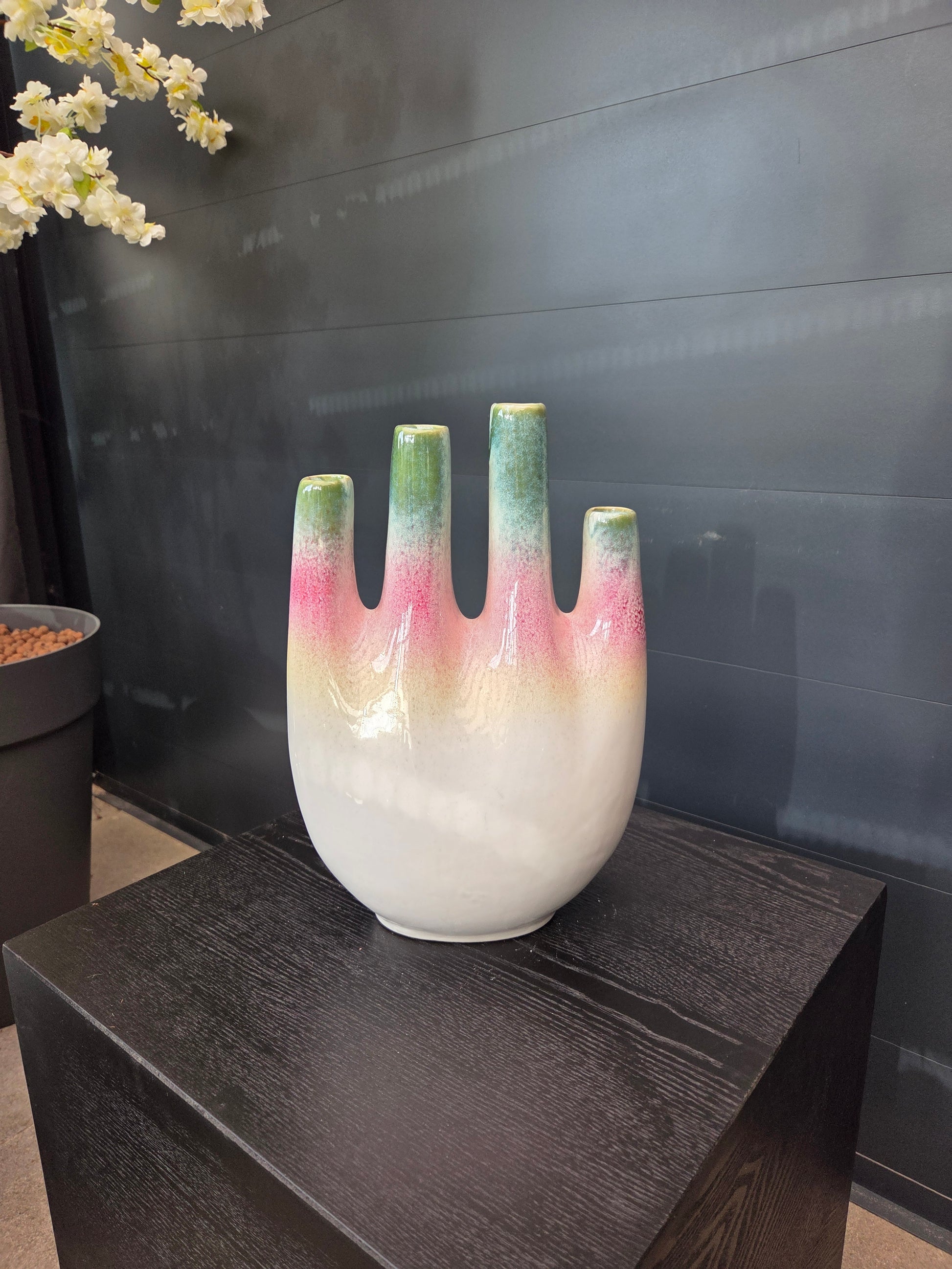 Vaas multi is een vrolijke en kleurige vaas. In combinatie met tulpen of het weelderige boeket Nicole hoef je je geen zorgen te maken over de invulling van een kaal stuk in jouw interieur!