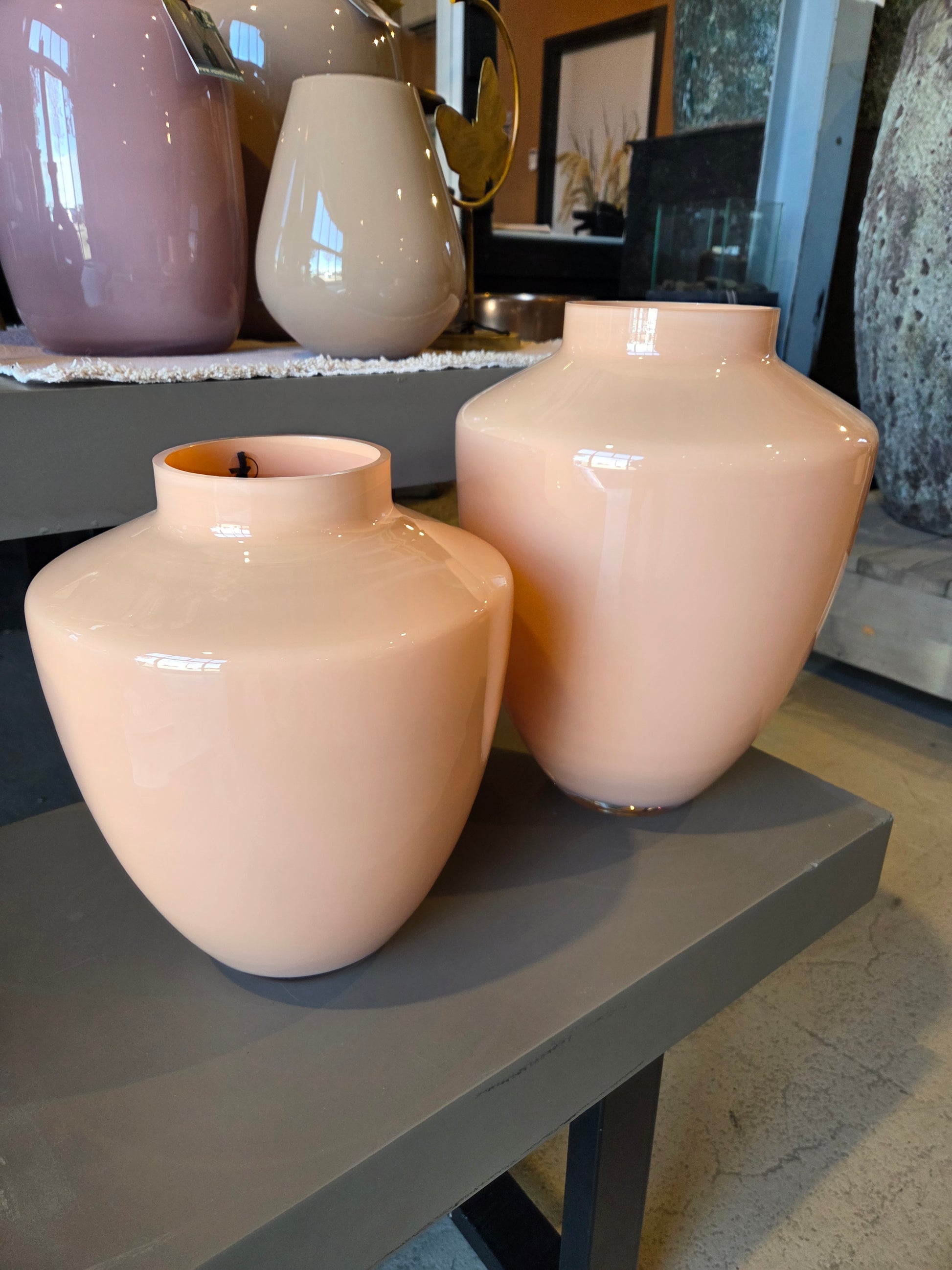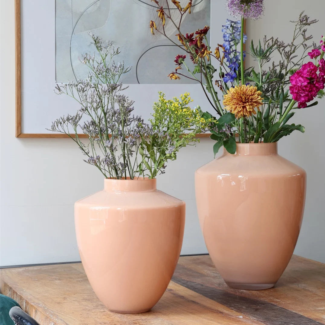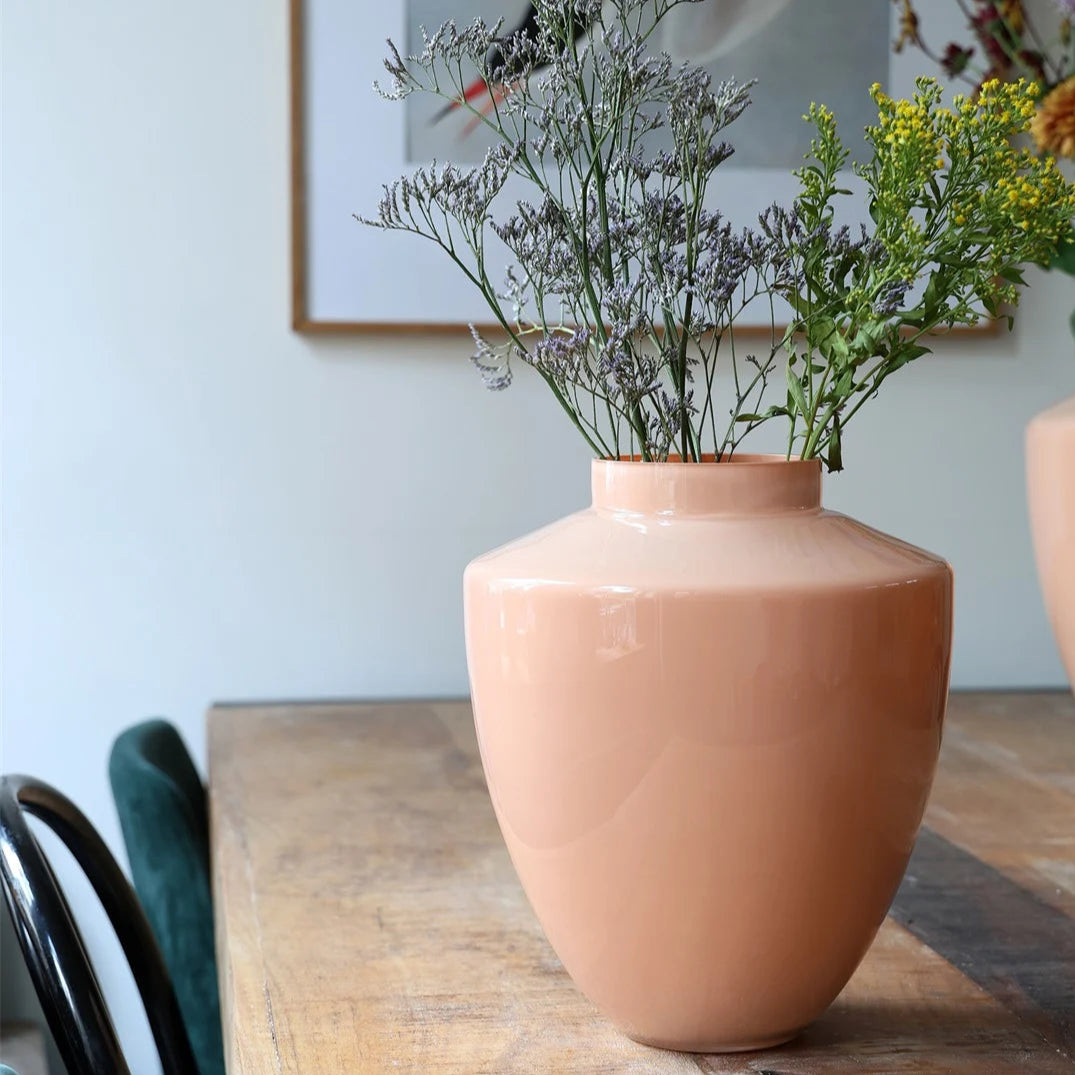 Hoe gaaf is deze pastel perzikkleurige vaas? Hij is prachtig te combineren met alle boeketten. Of het nu een kleurrijk boeket is of een rustiek boeket, een hele bos of juist een paar takken, alles past! Omdat deze vaas mondgeblazen is is letterlijk elke vaas uniek en geen 1 hetzelfde.