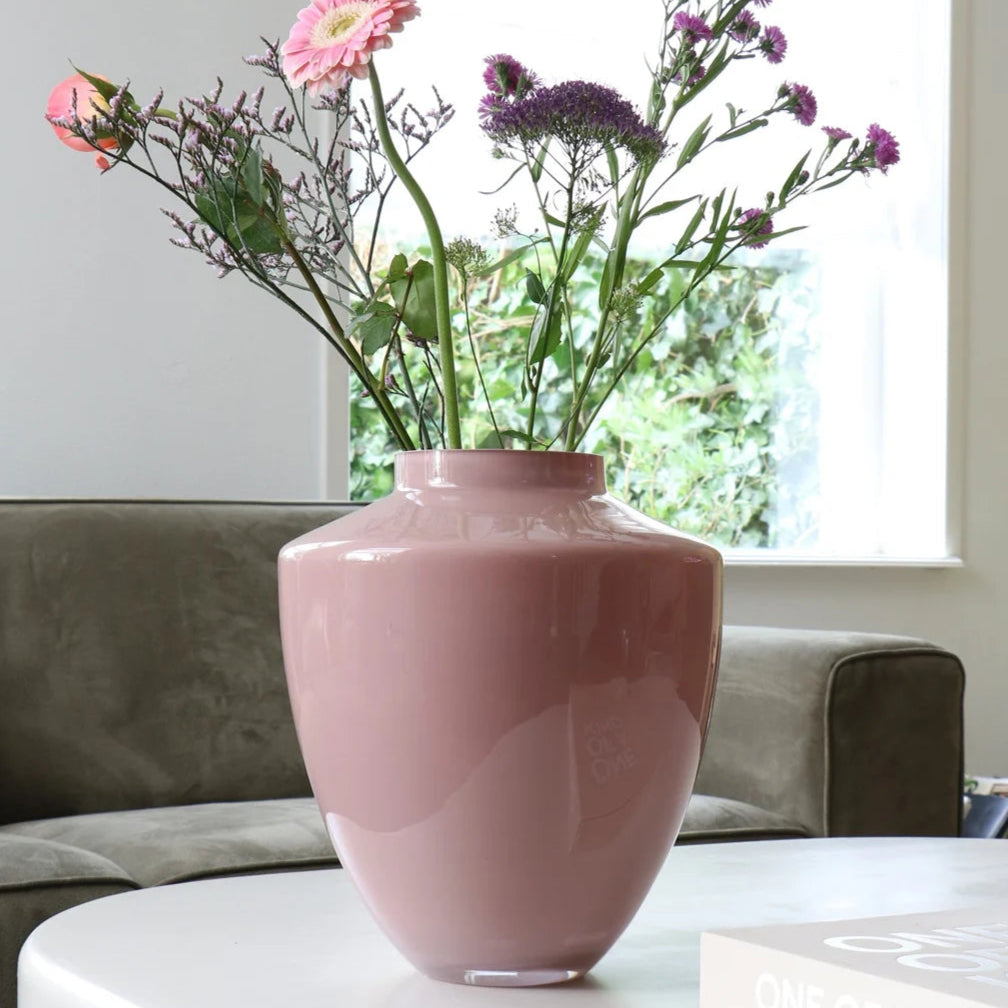 Hoe gaaf is deze pastel roze vaas? Hij is prachtig te combineren met alle boeketten. Of het nu een kleurrijk boeket is of een rustiek boeket, een hele bos of juist een paar takken, alles past! Omdat deze vaas mondgeblazen is is letterlijk elke vaas uniek en geen 1 hetzelfde.